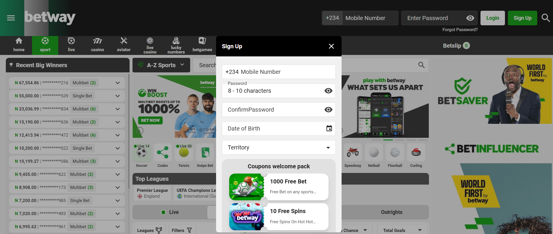 - Registering on Betway Nigeria is quick and requires a valid phone number.